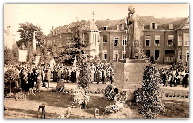 Onthulling standbeeld dr.. Ariëns op 16 juni 1934 op het Ariënsplein in Enschede tegenover het St. Josefziekenhuis.