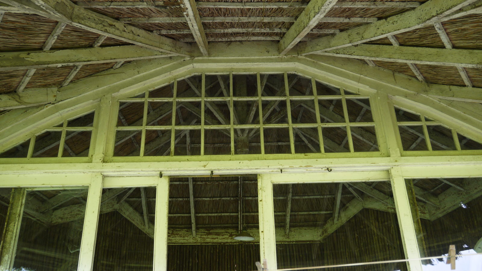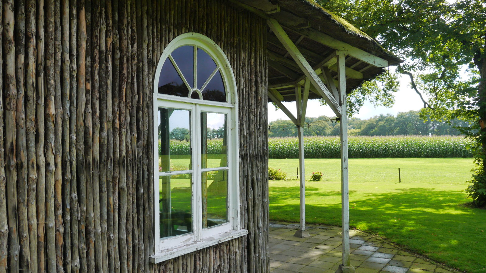 De theekoepel is geplaatst in de slagschaduw van de boerderij en de eeuwenoude eikenbomen. De constructie is even opmerkelijk als eenvoudig. De theekoepel is voorzien van een overdekt terras en een binnenruimte. De binnenruimte is afgesloten met een later geplaatst glaskozijn die voorzien is van twee schuifdeuren. In de binnenruimte bevinden zich nog een tweetal ramen. De dakconstructie is van binnenuit zichtbaar. Het rieten dak is in belangrijke mate voorzien van mosgroen. De buitenwanden van de theekoepel is constructief gemaakt van houten stokken die in de lengte zijn bevestigd. Het uitzicht vanuit de theekoepel is zeer panoramisch.