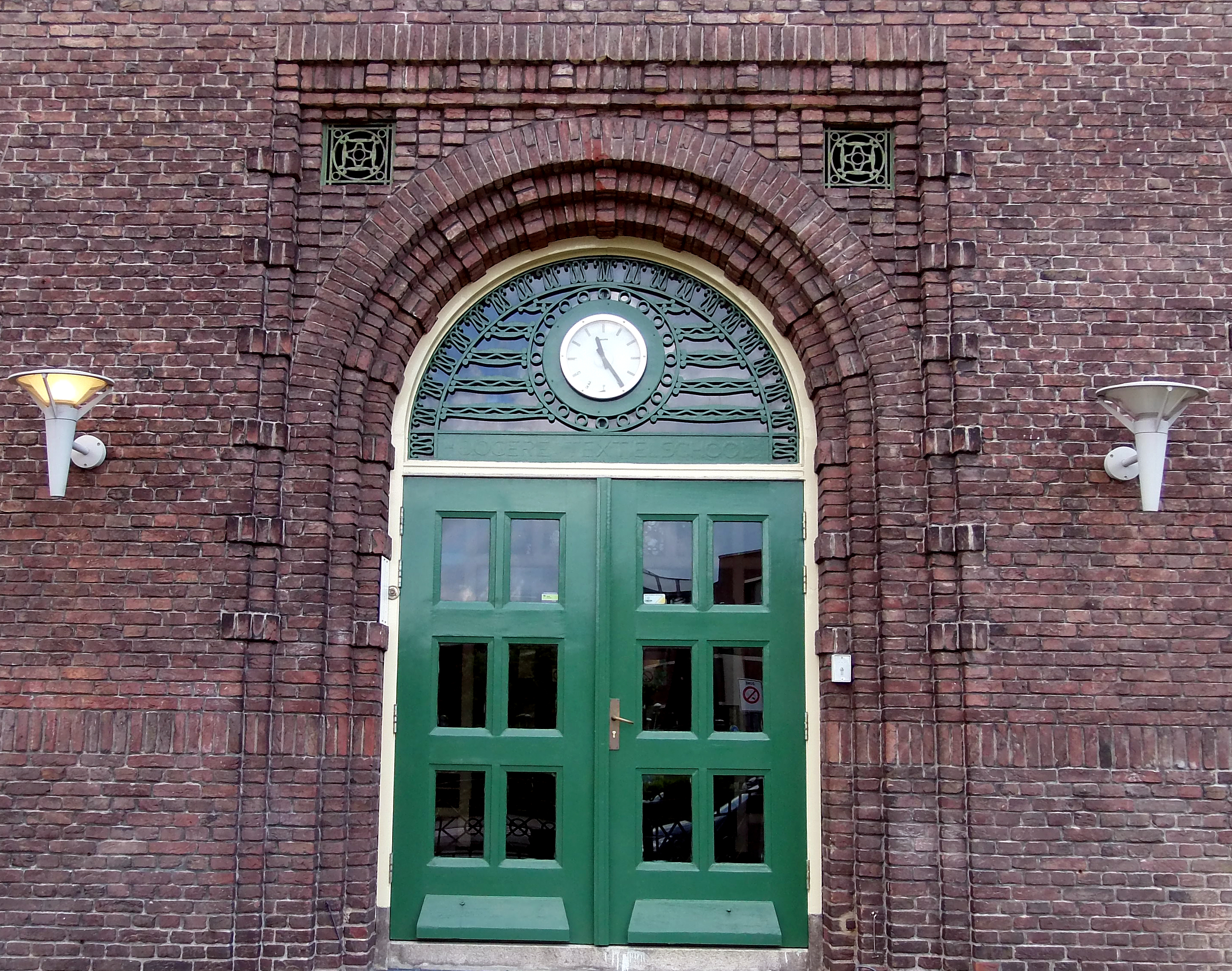 Onder en boven de vensters op de verdieping zijn tegelfriezen aangebracht met voorstellingen uit de (textiel)industrie. Het praktijkgebouw telt één bouwlaag en is afgedekt met sheddaken met een ijzeren spantenconstructie die rust op drie dragende muren: oostelijk de -voormalige- buitenmuur, westelijk waarschijnlijk de grensmuur tussen praktijkgedeelte en hoofdgebouw en centraal de muur die, vanaf de hoofdingang, de rechterwand van de middengang vormt.